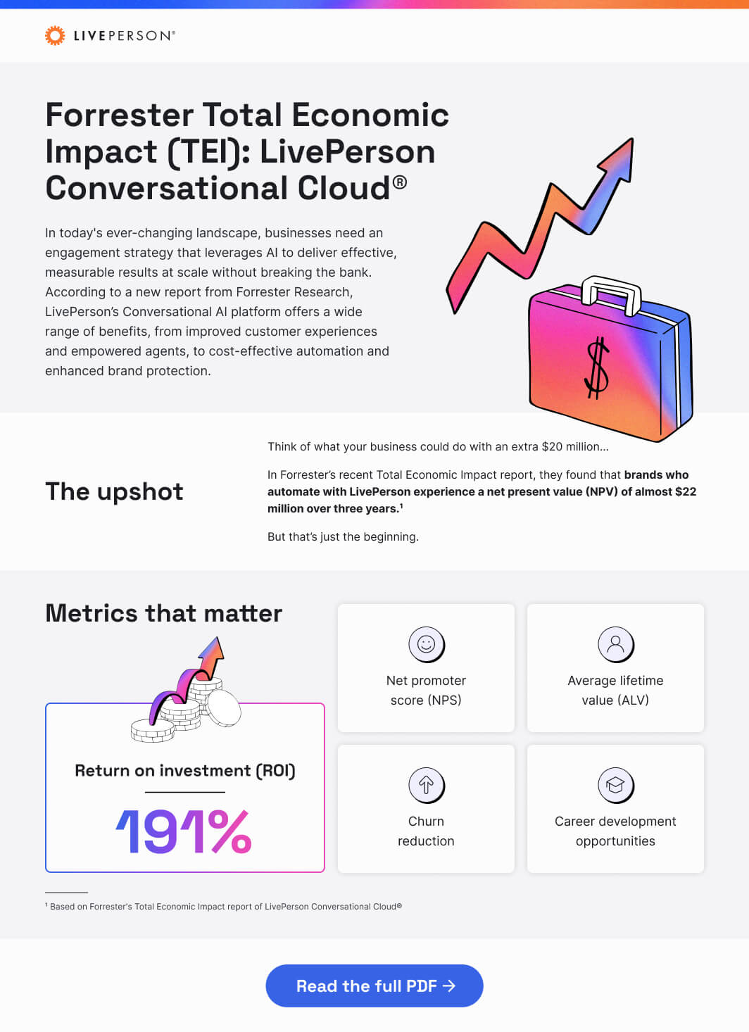 Along with a return on investment of 191%, LivePerson customers were able to improve their Net Promoter Score (NPS) and average lifetimes value (ALV), reduce churn, and boost career development. Take a look at some customer feedback about the benefits of Conversational AI and LivePerson as shared in the full report, then dive into more case studies here:
