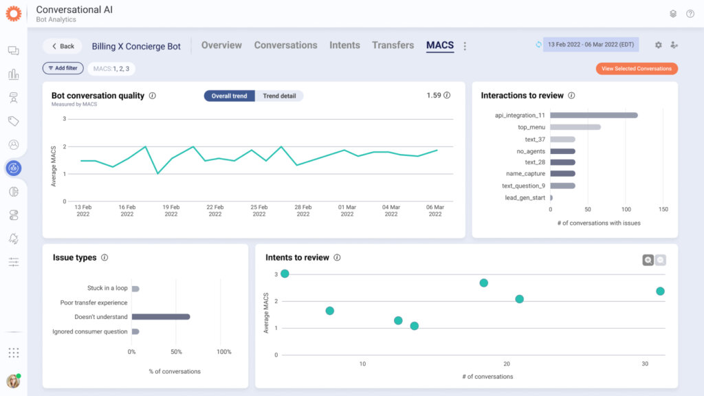 LivePerson recently released an AI function that enables virtual agent introspection. First, it identifies conversations that contain issue types, or frustrating events. For instance, in the example conversation, the virtual agent Doesn’t Understand the consumer. Once all the issue types are identified, the pipeline rates the customer’s experience during that conversation on a scale of 1-3. The score becomes MACS — the Meaningful Automated Conversation Score.